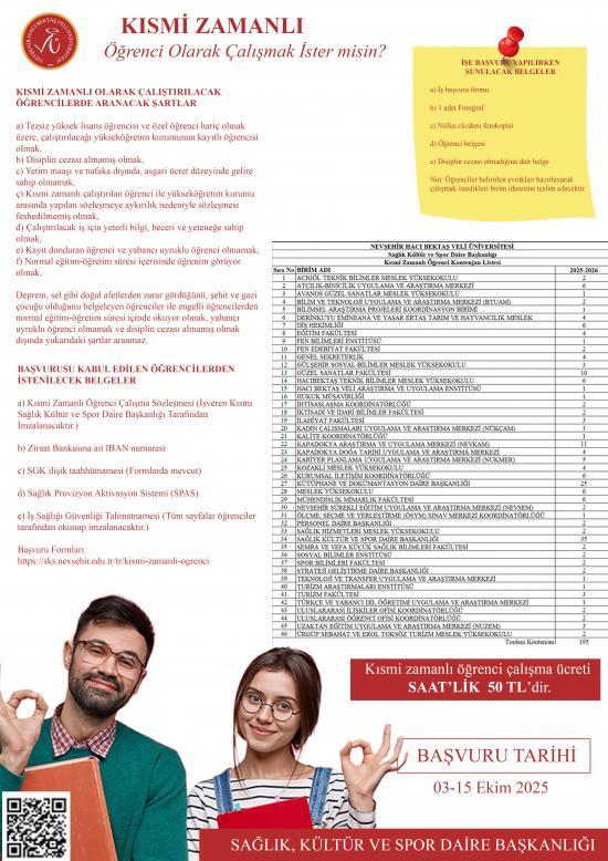 KISMİ ZAMANLI OLARAK ÇALIŞMAK İSTEYEN ÖĞRENCİLERİN BAŞVURULARININ ALINMASI 06/10/2025 DUYURULAR KISMİ ZAMANLI OLARAK ÇALIŞMAK İSTEYEN ÖĞRENCİLERİN BAŞVURULARININ ALINMASI Rektör-Öğrenci Buluşması ve Oryantasyon Programı TURİZM İŞLETMECİLİĞİ 2025-2026 GÜZ YARIYILI DERS PROGRAMI Zorunlu Yabancı Dil I-II Dersi Muafiyet Sınavı Duyurular