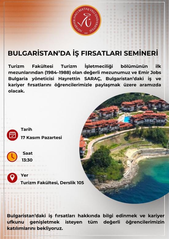 Fakültemizin ilk mezunlarından (1984–1988), Emir Jobs Bulgaria yöneticisi Sayın Hayrettin SARAÇ tarafından “Bulgaristan’da İş Fırsatları” başlıklı bir seminer verilecektir. Uluslararası turizm sektöründeki kariyer olanaklarını doğrudan sektör temsilcisinden dinlemek isteyen tüm öğrencilerimiz etkinliğimize davetlidir.