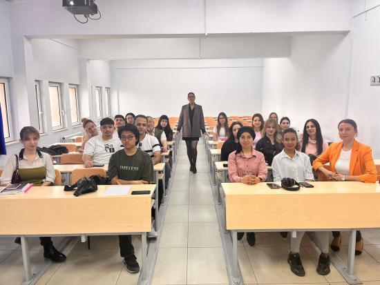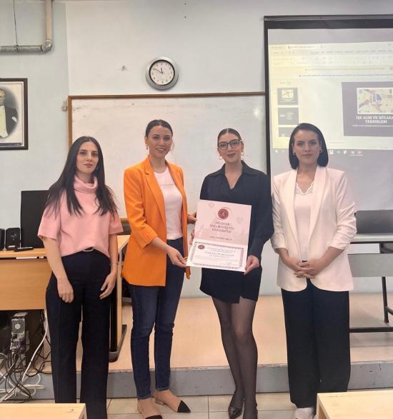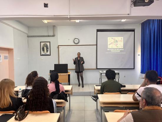 Fehime Özmutaf, derste insan kaynakları süreçlerine dair önemli bilgiler paylaşarak özellikle işe alım süreci ve mülakat teknikleri üzerine kapsamlı ve uygulamaya dönük bir sunum gerçekleştirdi. İşe alım sürecinin aşamalarını detaylı şekilde ele alan Özmutaf, öğrencilerin mülakat sürecinde dikkat etmeleri gereken noktaları örneklerle açıkladı. Öğrencilere sektörde sıkça karşılaşılan mülakat türleri, aday değerlendirme kriterleri ve etkili iletişim teknikleri hakkında pratik bilgiler aktaran Özmutaf, aynı zamanda gerçek mülakat senaryoları üzerinden değerlendirmeler yaparak öğrencilerin süreci daha iyi kavramalarına katkı sağladı. Deneyimlerinden somut örnekler paylaşarak dersi interaktif hale getiren Özmutaf, öğrencilerin sorularını da yanıtlayarak kariyer planlamalarına yönelik önemli ipuçları sundu. Ders sonunda Fehime Özmutaf’a katkılarından dolayı teşekkür belgesi takdim edildi.